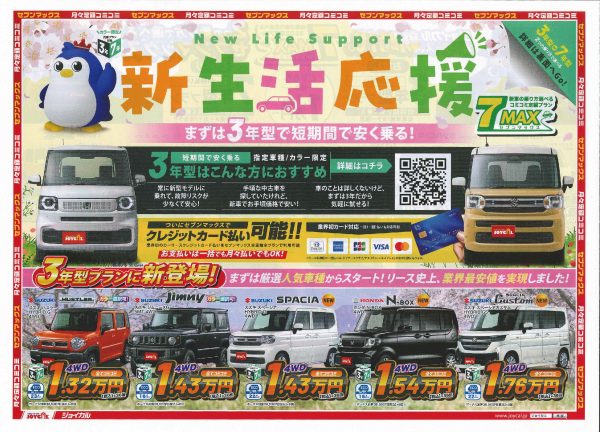 また、メンテナンスも格安で含まれているのでお得です。- チラシ掲載以外の車種やグレードは選べますか?